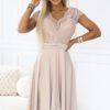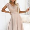 Are you looking for a styling that will work for a family gathering and an elegant dinner? The Linda dress in a light, beige shade looks beautiful in photos and provides comfort throughout the day. Choose it for a wedding or other special occasions when you want to look classic and feel confident. The model has a lace top with a sweetheart neckline and short lace sleeves. The waist is accentuated with a smooth belt with delicate folds, and the bottom is a flared midi skirt that falls nicely in movement. Lace is also found on the back, making the whole look cohesive and elegant. Made in Poland.