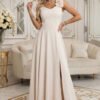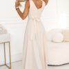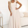 Beige maxi dress with a flower on the shoulder. This is the type of outfit in which you enter a ceremony calm and confident, because everything looks exactly as it should. The beige shade adds class, and the softly falling bottom beautifully works with every step. Perfect when you want to look elegant. The maxi dress has a fitted top with wide straps and a subtle V-neckline. The decorative flower on the shoulder attracts attention and replaces jewelry when you opt for simplicity. The waist is gently accentuated, and the flared bottom creates a light, feminine movement. In the back, there is a V-neckline, a covered zipper, and a belt to tie, which forms an elegant bow. If you are looking for an outfit for a wedding, reception, or elegant dinner, this long dress will be a choice that you will enjoy coming back to. Made in Poland.