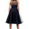 Evening dress cut off at the waist. The top is fitted with a tulle neckline tied at the back with a velvet ribbon. The bottom is flared, layered with a top tulle layer finished with satin trim.
