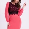 Dress in a fitted cut with long sleeves. On the front sewn lace in black.