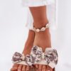 Stylish cork sole slippers are characterized by a contoured insole. Made of eco suede and textile material. The front is adorned with a bow. The slippers are versatile and perfect for everyday activities, work or shopping. It is an ideal choice for summer days!