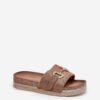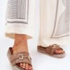 Slippers made of eco-suede. At the front, there is a decorative golden detail that gives them a subtle glow. Set on a platform decorated with sequins, they bring a bit of glamour to every outfit. The profiled insole ensures comfort throughout the day. Perfect for summer days, these slippers go well with dresses, skirts, or pants, combining a trendy look with functionality.