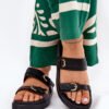 Stylish women’s sides on a platform that harmoniously combine comfort with a modern look. The front part of the slides features two straps with buckles, adding character and subtly attracting attention. The platform guarantees a sure step and stability throughout the day. Perfect for everyday wear, they pair well with both dresses and pants, making them a versatile element of any summer wardrobe.