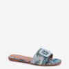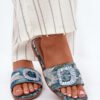 Women’s flat-heeled sandals made of textile material. They are distinguished by a decorative buckle at the front, which adds style and elegance. A perfect choice for summer days, light, comfortable and fashionable, they will work great for everyday wear.