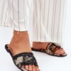 Ladies’ flat-heeled sandals, made of textile material. They are distinguished at the front by a decorative buckle that adds style and elegance. A perfect choice for summer days, light, comfortable, and fashionable, they will work great for everyday wear.