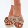 Women’s sandals made of synthetic material. Set on a braided platform, they are a stylish and comfortable option for warm days. There is a subtle bow at the front that adds charm to them. Lightweight and comfortable, they go well with dresses, skirts, and pants.