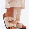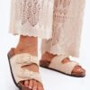 Crocheted women’s slippers on a cork platform are a unique proposal for warm days. Thanks to the profiled insole made of eco-suede, they provide comfort and convenience throughout the day. Two golden buckles add an elegant character to them. Perfect for summer stylizations, these slippers will be an excellent choice for dresses, skirts, and pants.