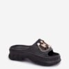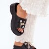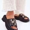 Women’s flip flops made of foam material, set on a platform, are a stylish choice for warm days. Golden, charming pins on the strap give them a fashionable character. Perfect for holiday trips, days spent by the pool or at the beach.