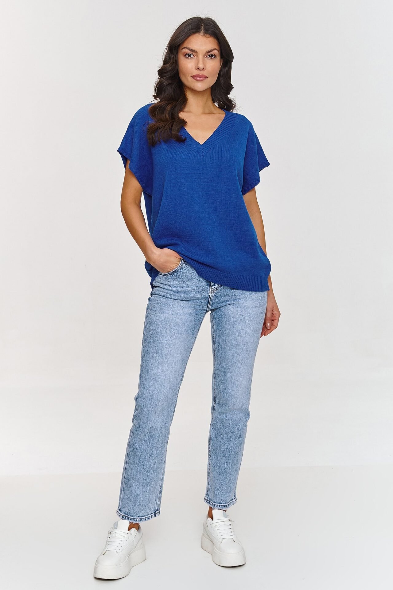 This sweater vest is a stylish and comfortable wardrobe piece that will surely add freshness to any outfit. Made of soft material, it ensures comfort throughout the day. The V-neck is one of the most elegant and versatile styles, gently elongating the neck and adding lightness to the whole outfit. The loose, oversized fit of the model is perfect for different body types, providing comfort and freedom of movement. The short sleeve in the form of wide sleeves introduces a fashionable, casual accent, perfect for warmer days and great for layering on cooler days. Made of a blend of fibers, including PBT, the vest has exceptional properties. PBT is a fiber that maintains its shape and structure for a long time, ensuring that it does not lose its aesthetics and is more durable. Thanks to the elasticity of PBT, the model perfectly fits the silhouette, providing comfort throughout the day. The sweater vest not only looks fashionable, but is also functional and comfortable. You can combine it with various wardrobe pieces, from casual jeans to elegant skirts, creating outfits for different occasions.