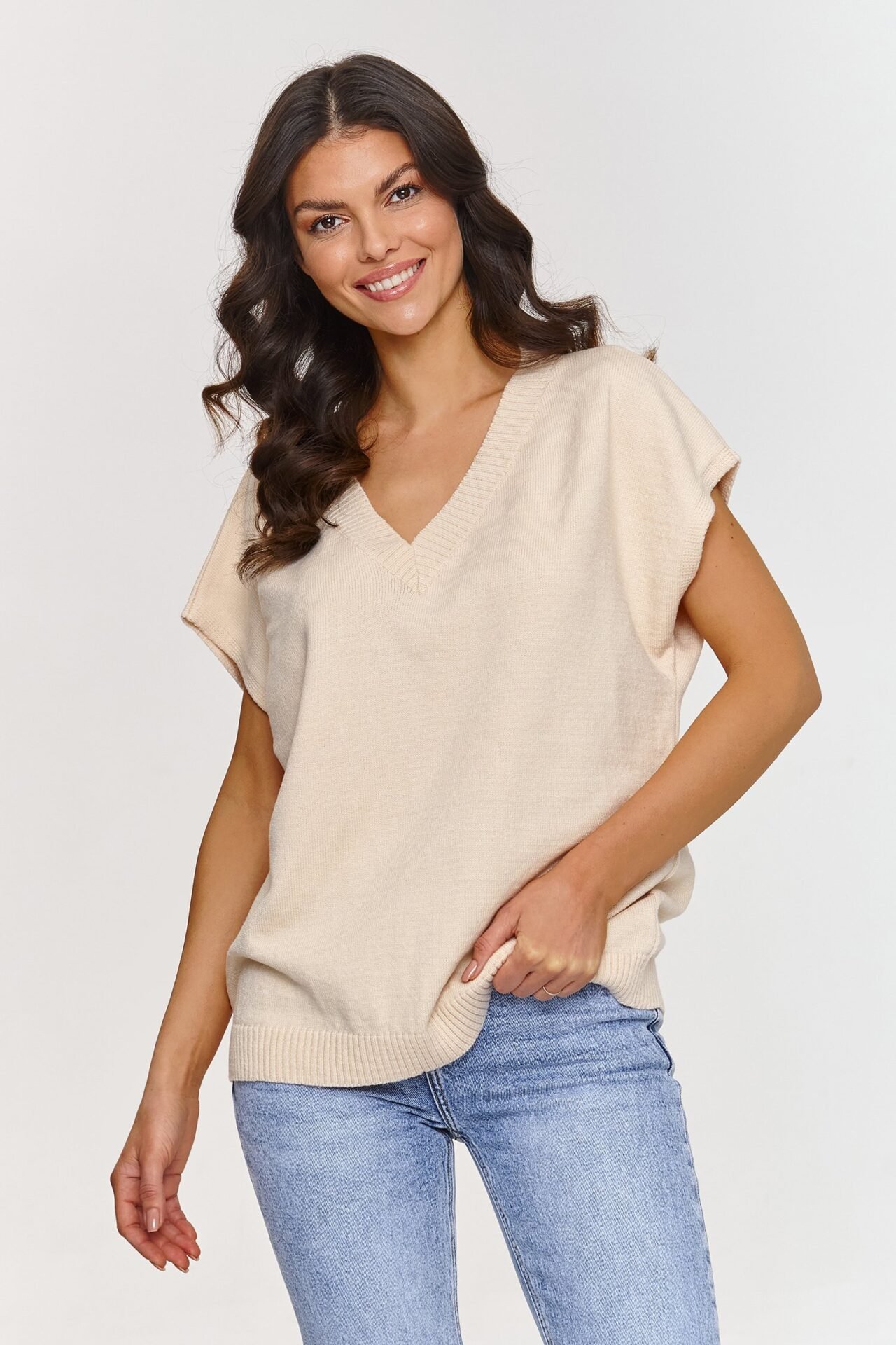 This sweater vest is a stylish and comfortable wardrobe piece that will surely add a touch of freshness to any outfit. Made of soft material, it provides comfort throughout the day. The V-neck is one of the most elegant and versatile styles, gently elongating the neck and adding lightness to the entire outfit. The loose, oversized fit of the model is perfect for different body types, providing comfort and freedom of movement. The short wide sleeves add a trendy, casual touch, perfect for warmer days and for layering on colder days. Made of a blend of fibers, including PBT, the vest has exceptional properties. PBT is a fiber that maintains its shape and structure for a long time, ensuring that it does not lose its aesthetics and is more durable. Thanks to the flexibility of PBT, the model perfectly fits the silhouette, providing comfort and convenience throughout the day. The sweater vest not only looks fashionable, but is also functional and comfortable. You can combine it with various wardrobe pieces, from casual jeans to elegant skirts, creating outfits for different occasions.
