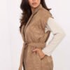 Elegant women’s quilted vest of standard length, fastened with a button and equipped with classic lapels. Made of polyester, with synthetic filling, it is lightweight and comfortable to wear, while also practical in transitional periods, ideal for autumn, winter, and spring. The model stands out with charming quilting and a varied texture of the material, giving it a unique character. There is a tie belt at the waist, which beautifully emphasizes the silhouette. Inserted pockets add functionality, and the brooch on the lapel is an elegant, subtle accent. It is an ideal proposal for everyday wear and work, combining comfort, feminine elegance, and timeless style, creating a universal wardrobe element.