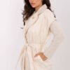 Elegant women’s quilted vest of standard length, fastened with a button and equipped with classic lapels. Made of polyester, with synthetic filling, it is light and comfortable to wear, while also practical in transitional periods, ideal for autumn, winter, and spring. The model stands out with charming quilting and a varied texture of the material, giving it a unique character. There is a tie belt at the waist, which beautifully emphasizes the silhouette. Inserted pockets add functionality, and the brooch on the lapel is an elegant, subtle accent. It is an ideal proposition for everyday wear and work, combining comfort, feminine elegance, and timeless style, creating a universal wardrobe element.