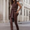 Stylish RUBY vest in brown shade is a perfect choice for women who value elegance combined with comfort. Made of high-quality materials, this vest will surely become a key element of any wardrobe. 95% viscose ensures wearing pleasure, while 5% elastane guarantees a perfect fit to the silhouette. The vest is 76 cm long, making it ideal for everyday wear as well as for more formal occasions. Thanks to a carefully considered cut, the vest looks great on different body types. The combination of viscose and elastane makes the vest not only comfortable to wear, but also easy to match with various stylings. Due to its versatility, it can be paired with a white blouse and pants for everyday wear, as well as with an elegant dress for evening outings. The RUBY vest is also a great choice for cooler days. You can wear it alone or layer it with other pieces, giving you the opportunity to create different looks depending on the occasion. Its brown shade harmonizes perfectly with other colors, making it easy to style. Choose the RUBY vest and emphasize your femininity and professionalism. It is a product that combines elegance, comfort, and functionality, perfect for the modern woman. Don’t hesitate, order today and enjoy a new, stylish addition to your wardrobe!