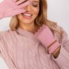 Elegant women’s gloves made of smooth material with contrasting inserts between the fingers. At the wrists decorative contrasting braided straps. Thumb and index finger with an embroidered flower, allowing you to operate the phone, without having to take off the gloves.