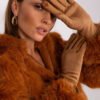 Elegant women’s gloves made of smooth material with contrasting inserts between the fingers. At the wrists decorative contrasting braided straps. Thumb and index finger with an embroidered flower, allowing you to operate the phone, without having to take off the gloves.
