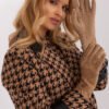 Elegant women’s gloves made of insulated material in a decorative geometric pattern. At the wrists decorative pompoms. Index finger with embroidered flower, allowing to operate the phone, without the need to take off the gloves.