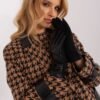 Elegant women’s gloves made from a combination of two different materials. At the wrists decorative straps with buttons. The index finger with an embroidered flower, allowing to operate the phone, without having to take off the gloves.