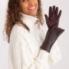 Elegant women’s gloves made from a combination of two different materials. At the wrists decorative straps with buttons. The index finger with an embroidered flower, allowing to operate the phone, without having to take off the gloves.