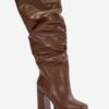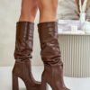 Women’s boots made of ecological leather. Set on a platform with a post heel, they guarantee stability and an elegant look. The model is slip-on, with rounded toes. Characteristic for this model is the crease on the upper.