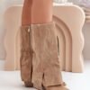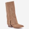 Natural suede mid-calf-length boots are an exceptionally stylish and elegant choice. The characteristic pointed nose gives them a sophisticated look, and the turned-up upper with decorative stitching is the main decorative element, adding originality and a subtle cowboy touch. The model is zippered for comfortable wear. Perfect for both casual and more elegant occasions.