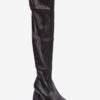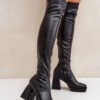 Fitted women’s boots made of eco leather, which perfectly highlight the legs. Set on a stable column heel, they provide elegance and comfort. The over-the-knee shaft adds chic, and the square toes give a modern character. Slip-on model, with an additional zipper closure for easy on and off. Slightly warmed inside with a shoe blanket. Stylish and feminine, great for various occasions.