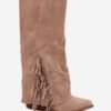 Slip-on cowboy boots made of eco suede, set on a column heel, are a combination of comfort and style. Pointed toes add elegance, and the shaft decorated with fringes introduces a light, boho accent. Perfect for casual stylings, they go great with dresses, skirts, and pants, giving each outfit a touch of cowboy charm.