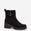 Women’s ankle boots made of eco suede. Set on a stable block heel, they provide a confident step, and the interior lined with soft shoe lining guarantees warmth on cooler days. The model fastened with a zipper facilitates quick putting on, and the decorative buckle on the top of the upper adds a fashionable, elegant accent.