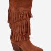 Cowgirl boots made of soft eco-suede are a model that combines comfort and trendy, distinctive style. They feature characteristic pointed toes and a stable, cut heel that adds lightness to the silhouette and emphasizes its feminine character. Decorative fringes on the shaft give the whole a dynamic look and introduce a hint of freedom in boho style. The interior of the shoes has been insulated with a shoe blanket, ensuring comfort and warmth on colder days, making them an ideal choice for the autumn-winter season. Fastened with a zipper. Fashionable details make these boots look great in both everyday casual outfits and paired with a dress or skirt, adding a unique character to the styling.