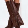 Eco-leather boots are characterized by a turned-over upper that elegantly covers the heel. The model has pointed toes, which adds elegance, and a side zipper makes them easy to put on and take off. Mounted on a slender stiletto, they reach the knee, accentuating the feminine silhouette. They are perfect for elegant stylizations for autumn and winter, and their interior is lined with shoe lining.