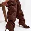 Women’s boots made of eco-suede. The model is set on a low stiletto heel. A characteristic feature of the shoes is the wide shaft, which not only gives them a fashionable look, but also makes the boots comfortable to wear and easy to adjust to any leg. The slip-on style makes it easy to put on and take off quickly, making the shoes practical for everyday use. These are boots that will work perfectly in both casual outfits and more elegant stylings, adding a refined character to them.