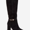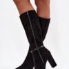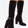Women’s boots made of eco suede are an elegant proposition that will work great in the autumn-winter season. The classic cut has been embellished with a subtle strap with a gold buckle placed on the upper, giving the whole a chic and feminine character. The model is set on a stable column heel, which slims the silhouette and at the same time ensures comfort while wearing. Rounded toes emphasize the timeless style of the shoes, and the interior lined with soft shoe lining guarantees comfort and warmth on colder days. These boots will perfectly complement elegant stylizations, but will also work well in everyday outfits.