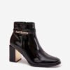 Women’s ankle boots made of patent eco leather. The model is set on a stable pillar-type heel, decorated with a mirrored element, looks exceptionally stylish. The upper is decorated with a thin strap with a gold detail. The shoes are fastened with a zipper, which ensures easy putting on. The insulated interior guarantees warmth and comfort on colder days. It is an ideal choice for women who appreciate elegance in their everyday outfit, perfect for work, meetings, or evening outings.