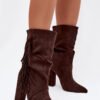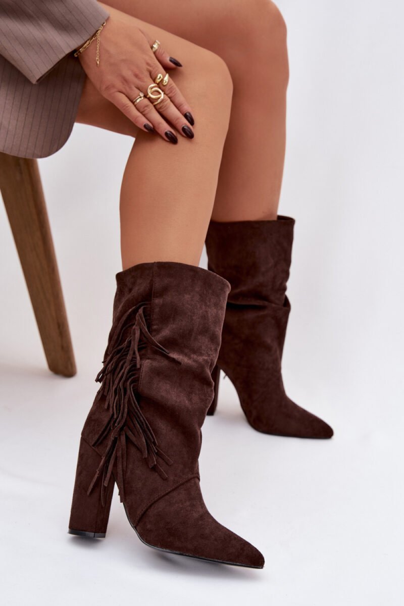 Women’s ankle boots made of soft eco suede. The model is set on a stable column heel and with pointed toes beautifully slenderizes the legs and adds lightness to the silhouette. The gathered upper and decorative fringes give the whole a unique, stylish character. The shoes are slip-on. The interior lined with a shoe blanket guarantees warmth and comfort on colder days. It is an ideal choice for women who like to combine comfort with a bit of boho elegance, perfect for both trousers and dresses.