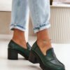 Women’s leather shoes. Set on a column shaped heel with a delicate platform. This model has rounded toes. The stiffened heel additionally stabilizes the foot. At the front, there is a strap with a small detail. The toes are rounded. An elegant style that you can match with both pants and dresses.