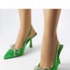 Elegant and stylish green stilettos with a bow from Wildrose are the perfect choice for summer evenings. They have a 12-centimeter heel that beautifully slims your silhouette. Made of high-quality material, and the green synthetic sole adds originality to them. Slip-on closure makes them comfortable to wear. These stilettos from the Summer collection will be a perfect addition to your wardrobe for summer outings.