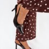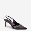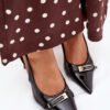 Stylish and elegant pumps made of eco-leather, set on a stiletto heel, are a combination of classic with a modern accent. There is a strap decorated with a gold buckle at the front of the shoe, which adds a unique chic to them. Pointed toes visually slim the legs, giving the silhouette an elegant look. Perfect for evening outings, special occasions or elegant meetings.