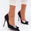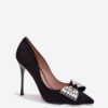 Women’s high heels made of faux suede are an exceptionally elegant model that attracts attention with subtle details. The delicate bow placed at the front of the shoe, decorated with sparkling crystals, adds a jewelry-like charm to them. Slim, pointed toes emphasize the feminine line of the foot and give the footwear a classic, elegant character. Perfect for special occasions when you want to present yourself stylishly and elegantly.