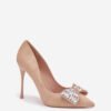 Women’s high heels made of eco suede are an exceptionally elegant model that attracts attention with subtle details. A delicate bow placed on the front of the shoe, adorned with sparkling crystals, adds a jewelry-like charm to them. Slim, pointed toes emphasize the feminine line of the foot and give the footwear a classic, elegant character. Perfect for special occasions when you want to present yourself stylishly and elegantly.