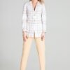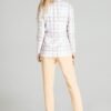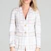 Spring, long jacket in checkered pattern, slim fit on a lining. Cheese neckline, no lapels, no pockets, two buttons.