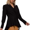 A unique tailcoat. Ultra feminine, with a well-defined waist emphasized by a tie at the side and a wavy tailcoat. Long sleeves are slightly creased at high cuffs with a slit. The jacket is fully lined.