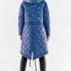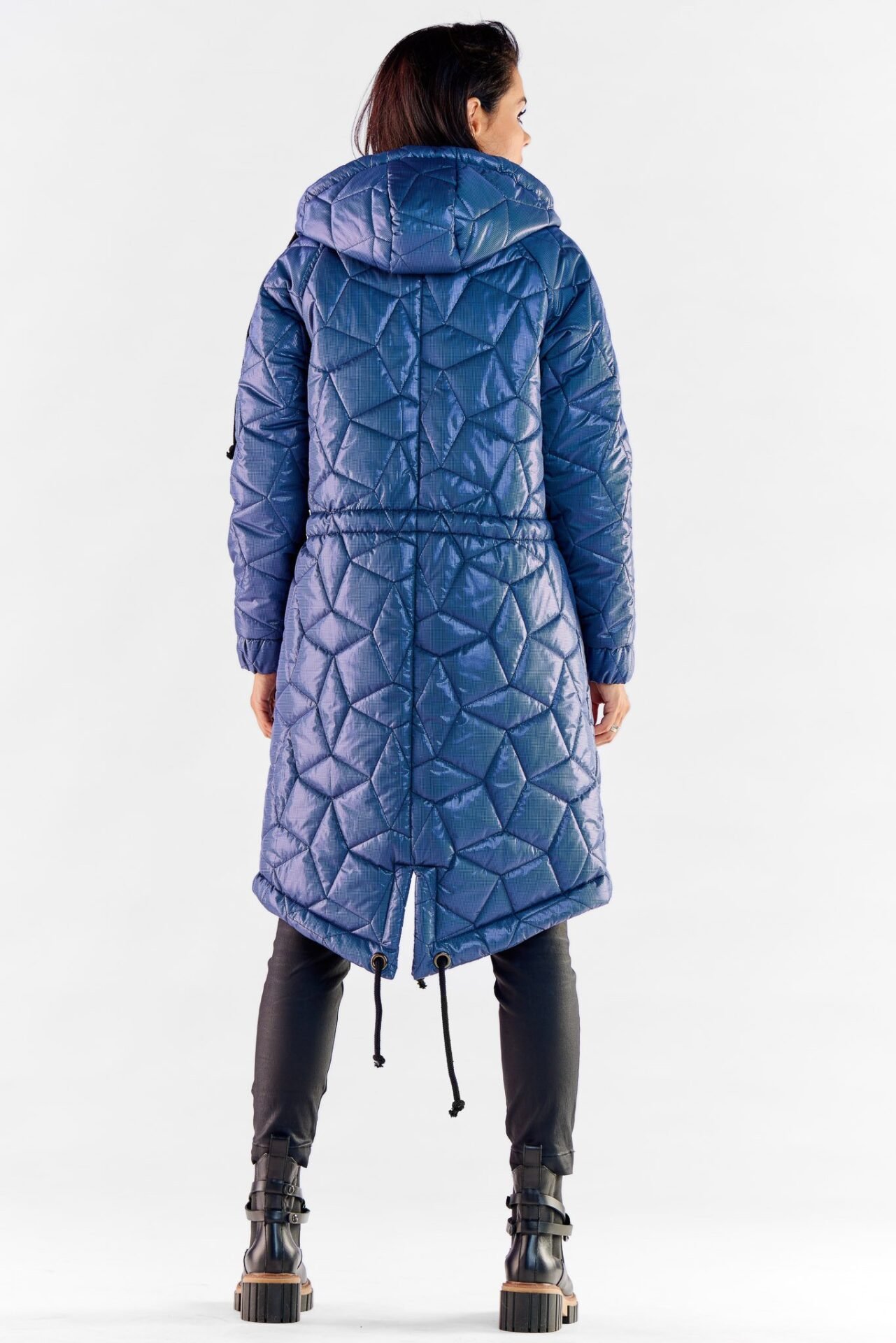 Quilted jacket with knee length, extended back with hood and straight sleeves. Widened towards the bottom, with a drawstring waist, zippered. It will work well as a rain jacket. The jacket is fully lined. The jacket is designed and sewn in Poland.