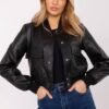 Women’s bomber jacket made of eco leather is a stylish and functional choice for the transitional season. Made of a combination of polyurethane, polyester, viscose, and cotton, it provides comfort and a fashionable look. Its classic, smooth design and casual style make it perfect for everyday outfits. The short cut accentuates the silhouette, and the long sleeve provides comfort on cooler days. The jacket is fastened with snaps, giving it a modern character. Additional pockets with flaps on the front emphasize the sporty style and increase practicality. The model is equipped with lining, making it ideal for transitional seasons.
