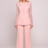 Stylish blazer that combines timeless form with modern detail. Made of smooth, high-quality fabric, it has been enriched with long sleeves made of elastic lace, adding lightness and a feminine character to the whole. The classic collar with lapels and a single button closure at the front give it an elegant, balanced look. The lack of pockets emphasizes the purity of the form, and the slightly tailored cut with a straight hem beautifully drapes on the silhouette, highlighting its assets. The hip-length makes the blazer perfect for both formal stylizations and more modern combinations, for example with jeans or a skirt. Designed and made in Poland with attention to detail and quality of workmanship. Lace 90% nylon, 10% spandex.