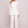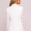 Stylish blazer that combines timeless form with modern detail. Made of smooth, high-quality fabric, it has been enriched with long sleeves made of elastic lace, which add lightness and feminine character to the whole. The classic collar with lapels and a single button front closure give it an elegant, balanced look. The lack of pockets emphasizes the purity of the form, and the slightly tailored cut with a straight hem beautifully complements the silhouette, highlighting its assets. The hip-length makes the blazer perfect for both formal styling and more modern combinations, such as with jeans or a skirt. Designed and made in Poland, with attention to detail and quality of workmanship. Lace 90% nylon, 10% spandex.