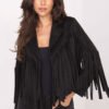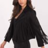 Women’s transitional jacket with a casual character, perfect for autumn, winter, and spring. Made of a blend of polyester and elastane, it impresses with a smooth texture of the material and a comfortable cut that works great in everyday stylizations. The model of standard length is equipped with a classic collar and lapels, which add a timeless style to the whole. The biggest decoration of the jacket is the fringes placed on the sleeves, front, and back, giving it an original, slightly boho character and distinguishing the stylization. Lightweight, without insulation and without fastening, it is a great addition to everyday sets, providing comfort and freedom of movement, while at the same time attracting attention with a non-trivial finish.
