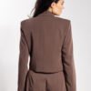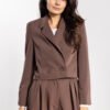 Stylish blazer with a loose cut combines classic with modern character. The shorter silhouette adds lightness, while the double-breasted button closure emphasizes elegance. Classic lapels and a straight shoulder line make the blazer look professional and elegant, while providing comfort. It pairs perfectly with wide trousers, as well as a skirt or dress, creating a versatile and stylish look for various occasions.