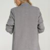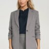 Stylish women’s jacket with a loose regular fit, made of material in a small houndstooth pattern. The model features classic, lapel collar and 3/4 sleeves with subtle pleats, adding lightness to the entire silhouette. The jacket is fastened with one button and has imitation pockets at the front, emphasizing its elegant, minimalist character. Shoulder pads are used for a better fit on the silhouette. The jacket is finished with a lining, ensuring comfortable wear and aesthetic finishing of the interior. An ideal option for both business and casual styling, it pairs perfectly with jeans, trousers, or a skirt.