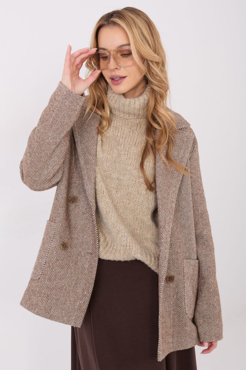 Women’s casual blazer is a perfect combination of elegance and comfort, ideal for everyday wear and work in the autumn/winter season. The model is made of high-quality cashmere blend with added elastane, which ensures comfort, softness, and gentle material elasticity. The blazer stands out with a classic fir tree pattern, giving it a timeless character. Standard length, long sleeves, and double-button closure emphasize the stylish cut and make the model look extremely elegant yet casual. The blazer has a lining for increased comfort, as well as sewn pockets adding functionality and a casual touch. The blazer is unlined, making it a great outer layer for cooler days or as part of layered outfits. It is a versatile choice that will complement both classic and more everyday outfits perfectly.