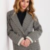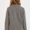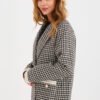 Tweed jacket with an elegant, classic cut, made of high-quality cotton, perfect for the autumn, winter, and spring seasons. A model of standard length, with long sleeves and a double-breasted button fastening. Lapels, cuffs, and inset pockets adorned with subtle pearls, adding style and feminine character to the jacket. The jacket has a lining, a smooth checkered pattern, and is unlined, making it suitable for both everyday and formal stylings, at work and for elegant occasions.