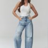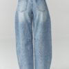 Stylish women’s jeans with distressed detailing and tapered bottom in a denim shade are the perfect choice for women who appreciate fashionable and comfortable style. The model slightly widens at the thighs and then subtly tapers towards the bottom, creating a modern, slightly balloon-shaped leg. The high waist beautifully accentuates the waist and visually lengthens the legs, providing comfort throughout the day. Trendy distressing gives the pants a casual and streetwear character. Classic pockets and button and zipper closure emphasize the timeless, denim design. These women’s jeans pair perfectly with a fitted top, oversized blazer, sneakers, or boots. Made in Italy.